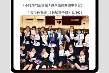 本校於2021年12月8日獲「香港教育城」邀請到灣仔會議展覽中心「學與教博覽會」中擔任推廣閱讀活動的嘉賓講者,與現場人士交流網上閱讀的策略及方法。其後接受「香港教育城」訪問,並刊登於2021年12月「教城電子報」EdPost「教學有道」欄目上,名為「不打烊的圖書館:讓學生從閱讀中學習」